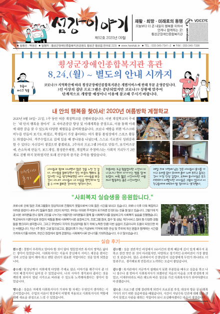 섬강이야기 52호 페이지 정보 작성자횡성군장애인종합복지관 작성일2025-11-10 첨부파일 섬강이야기52호.pdf (12.8M) 본문 섬강이야기 52호 이전글섬강이야기 53호 2025-11-10 다음글섬강이야기 51호 2025-11-10 목록 답변