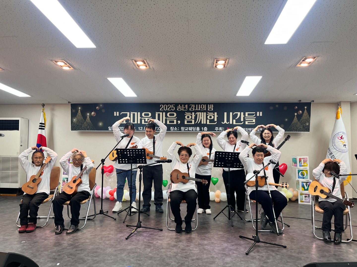 우쿨렐레 연주와 느티나무합창단, 장애예술인의 판소리 공연으로 행사의 문을 열었으며, 후원자, 자원봉사자분들께 감사패를 전달하고 2025년 사업 운영 현황과 활동 영상을 공유하는 뜻깊은 시간을 가졌습니다. 마지막으로 직원 공연과 만찬을 통해 따뜻한 연말 인사를 나누며 행사를 마무리했습니다.