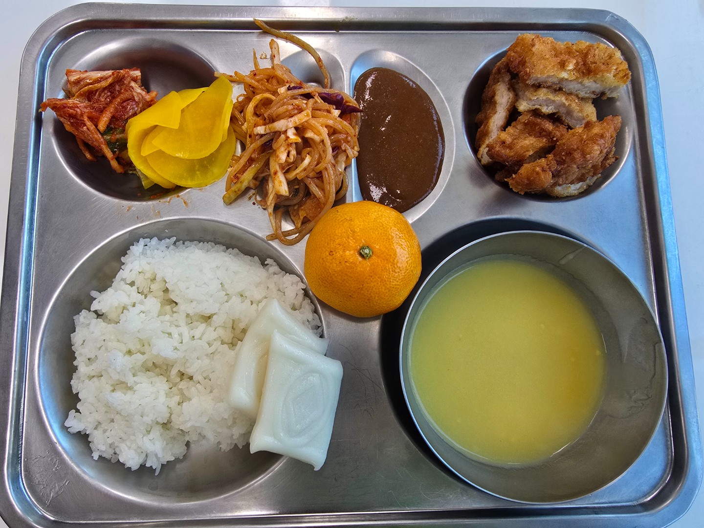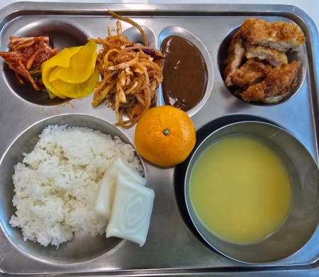 수제돈까스.돈까스소스.절편.귤.아이스크림을 후원해주셔서 급식소에서 맛있게 튀겨 조리하여 맛있는 중식을 함께할 수 있었습니다. 평소 급식소에서는 맛보기 힘든 직접 고기를 두드리고 밀가루와 계란. 빵가루를 입힌 돈까스를 200인분이나 넉넉하게 준비해 주셨습니다.