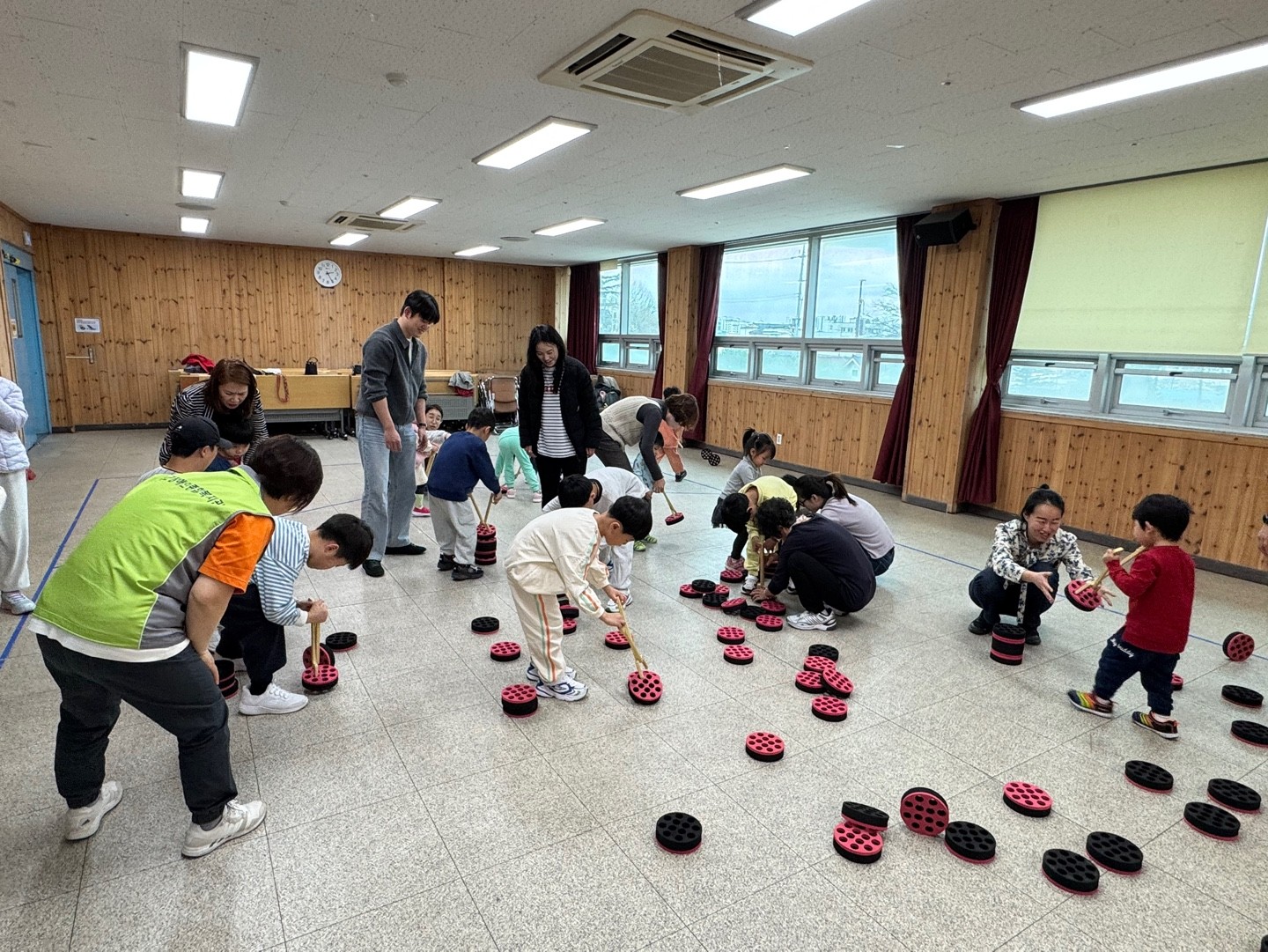 아이들의 집중력 향상을 위해 연탄집게로 연탄을 집어 나르는 활동을 보호자와 함께 진행하면서