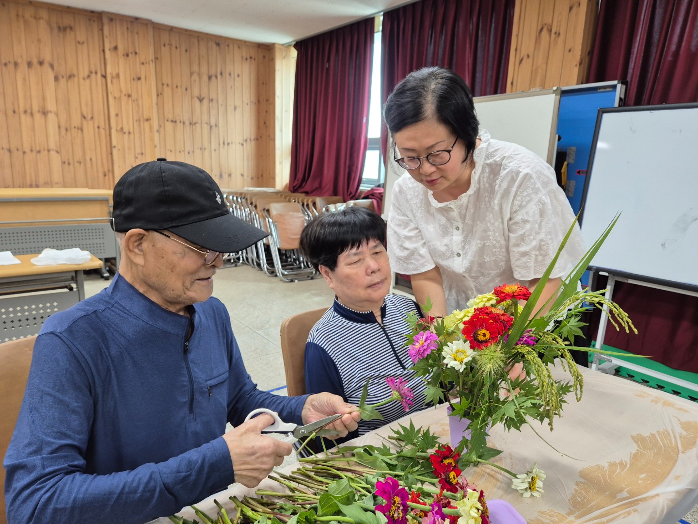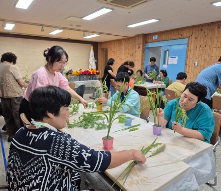 2025년 9월 4일 목요일 본 복지관 2층 강당에서 계절꽃을 활용한 꽃꽂이 원데이클래스를 진행하였습니다.
